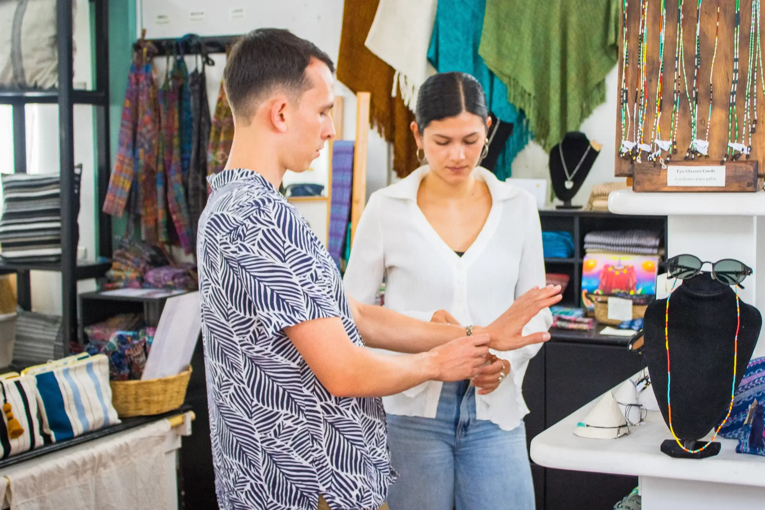 En el mercado de artisanos textiles, puede encontrar vestidos, bolsas, tapices y cualquier cosa de tela que puede imaginar. Todo en el estilo tradicional de Santa Cruz, por supuesto.